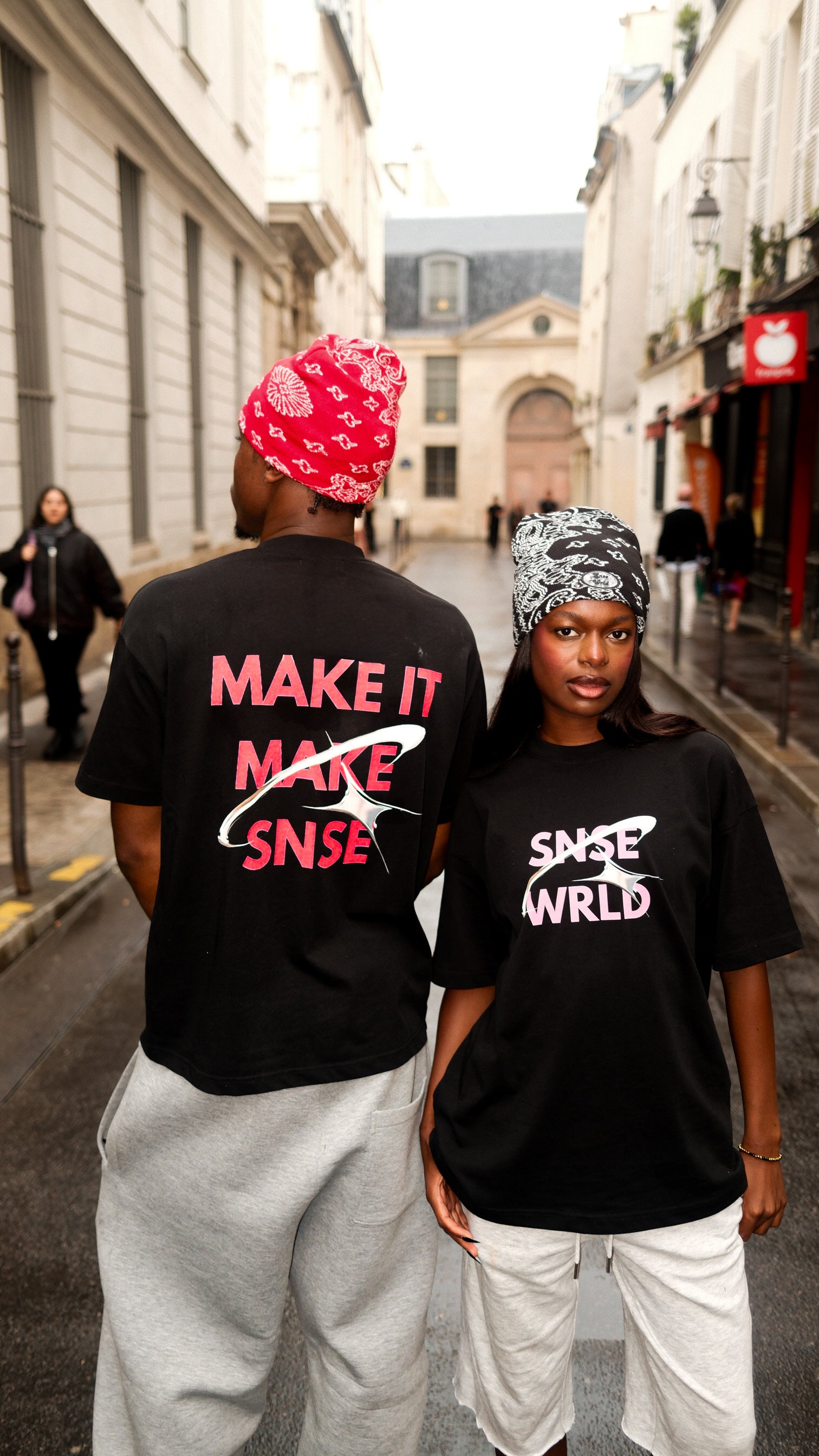- Bold red or pink lettering on oversized heavyweight cotton